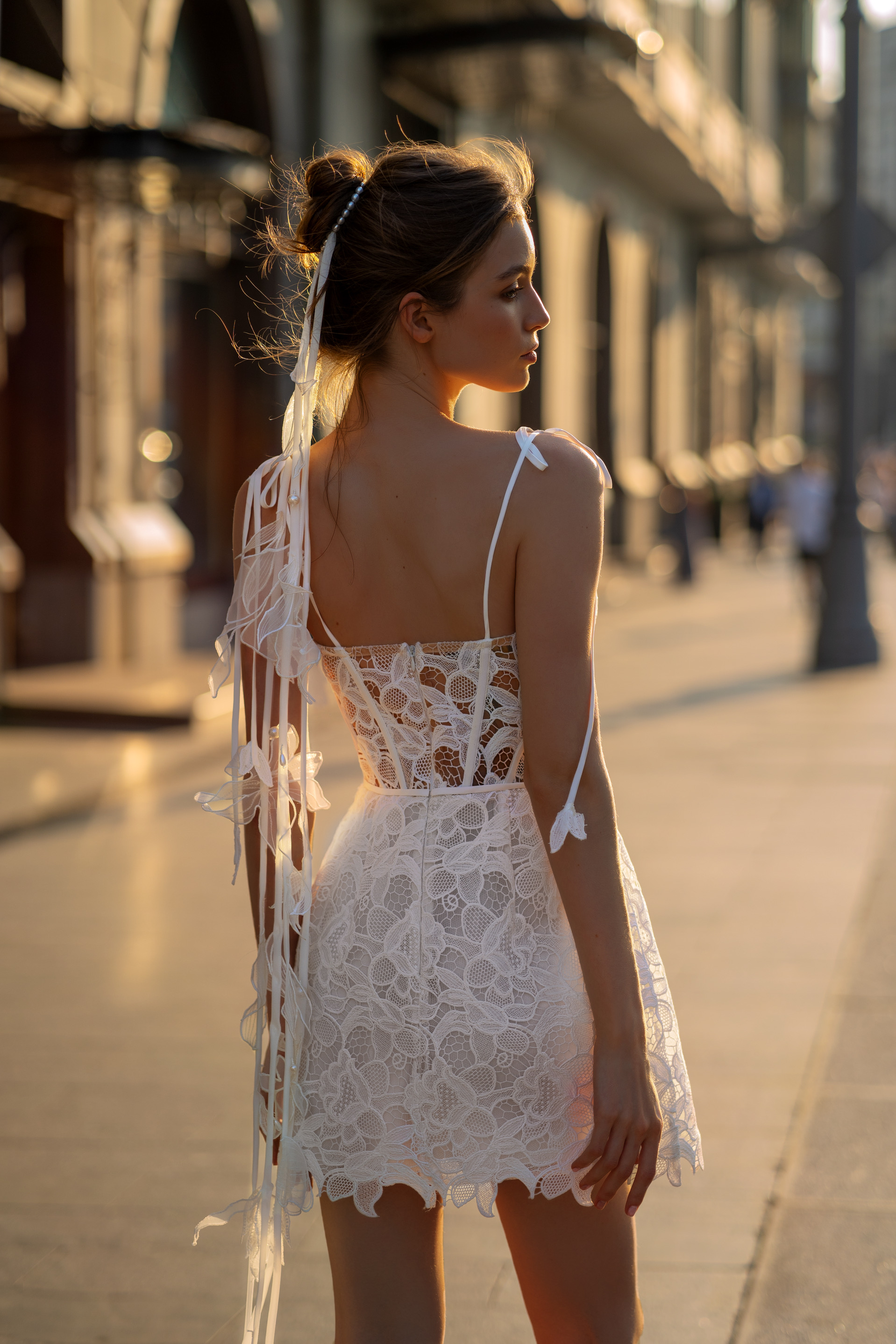 Fransız dantelli spagetti askılı mini afterparty elbisesi