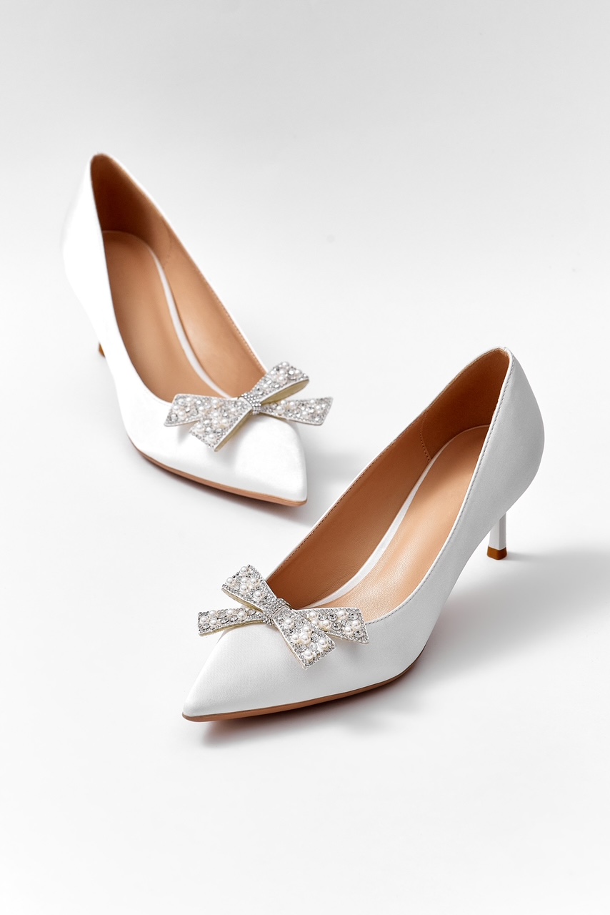 Sivri burunlu, parlak fiyonk detaylı beyaz stiletto.