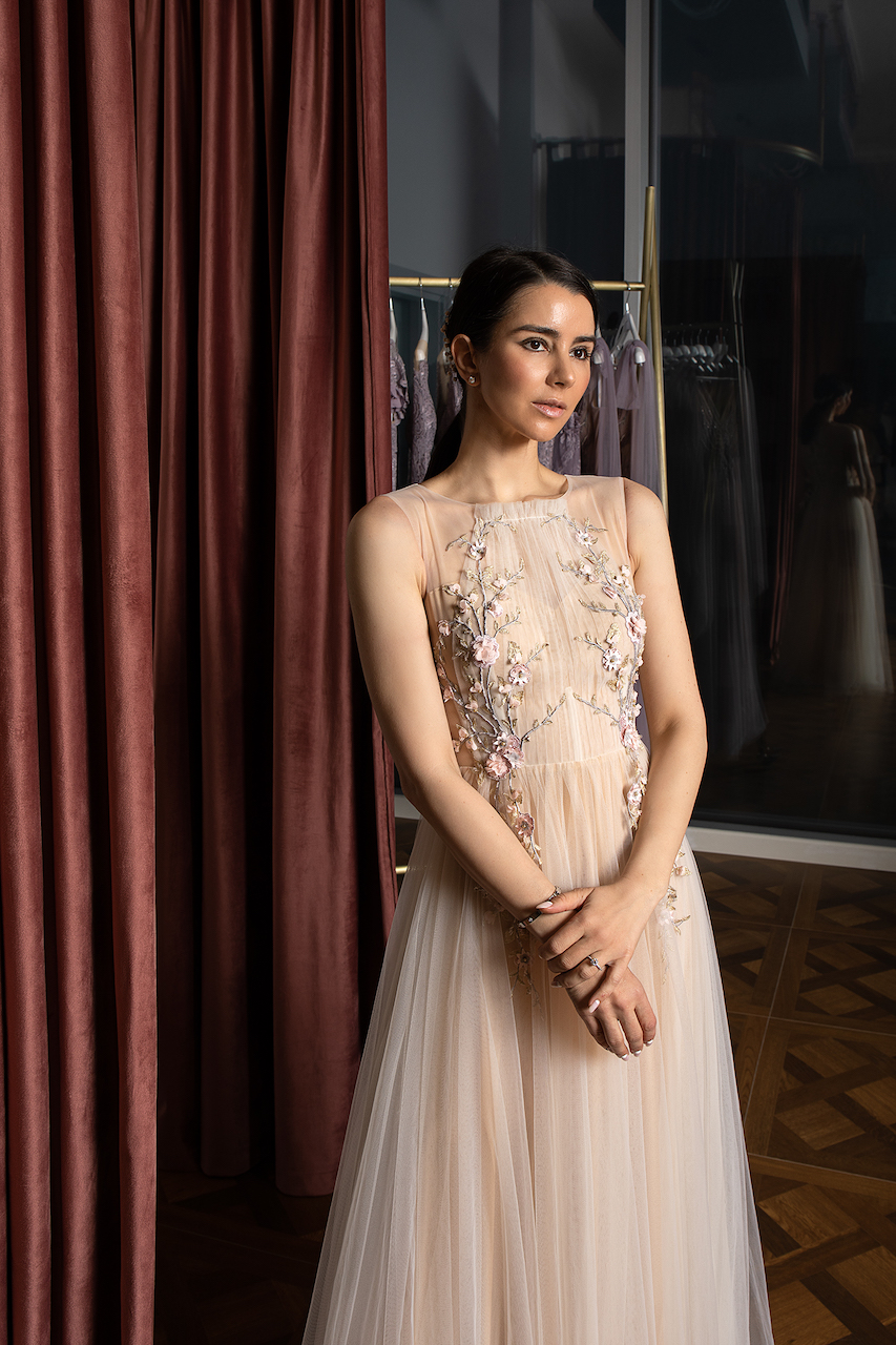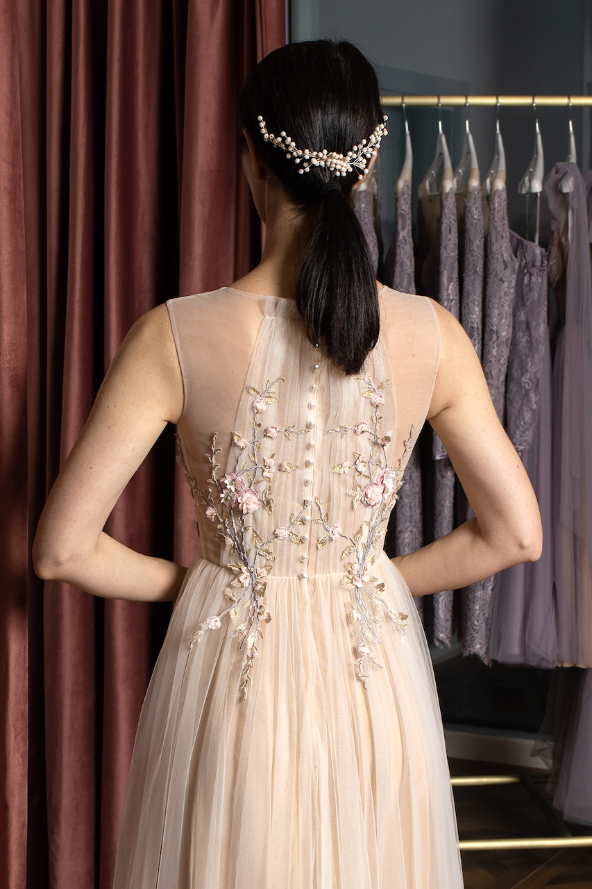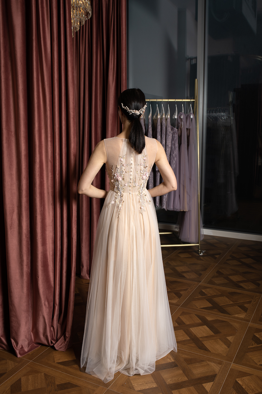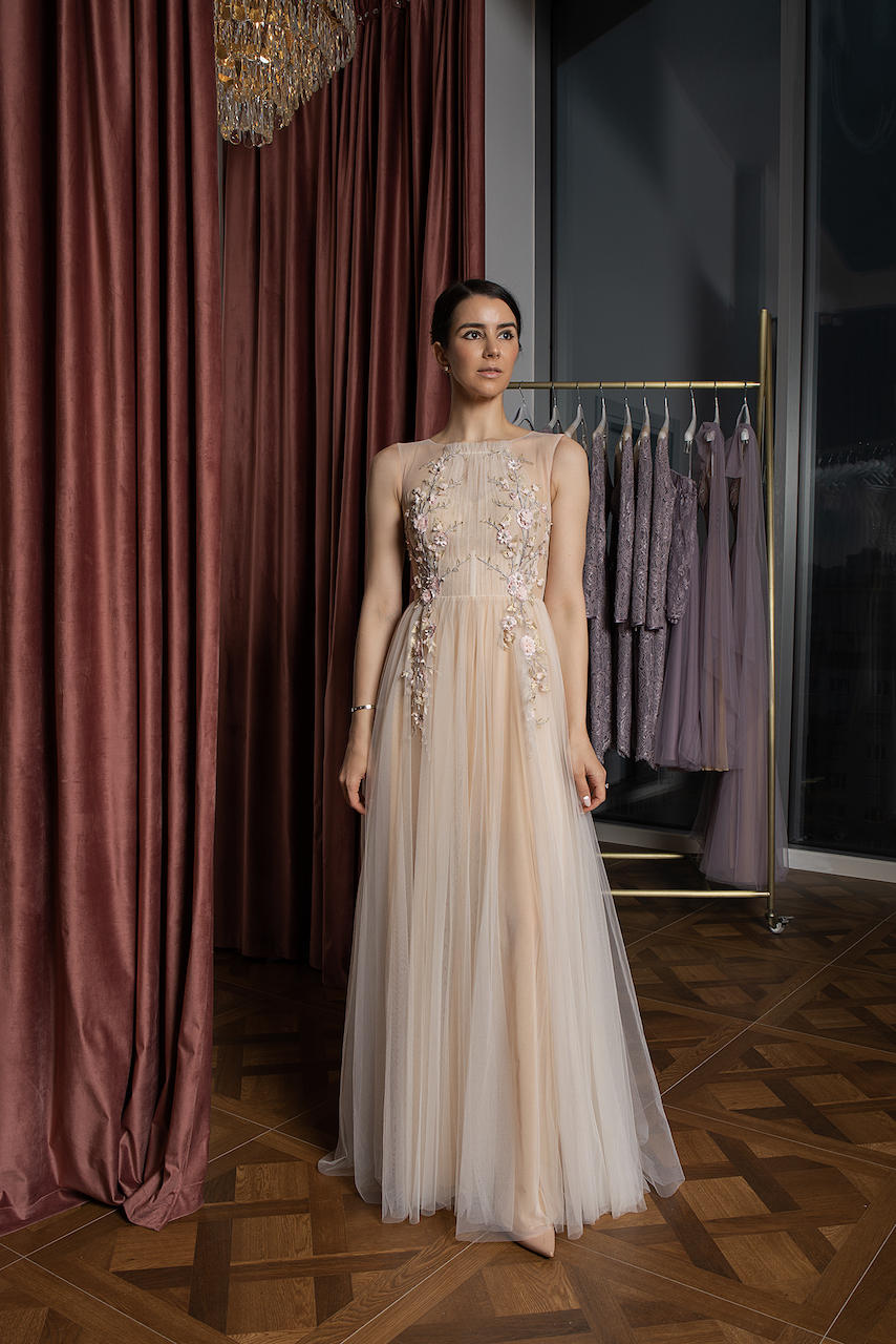 Çiçek işmemelerini sevenler bu eşsiz uzun elbiseye bayılacak. Zarif el yapımı çiçek işemeleri korseden eteğe geçişli bir şekilde yayılıyor. Ten rengi astar, tarzın daha şık ve şehvetli görünmesini sağlarken, büyüleyici inci düğmeler elbisenin arkasını güzelleştiriyor. Bu ince görünümlü abiye tartışmasız tatlı ve nazik doğanızı ortaya çıkaracak.