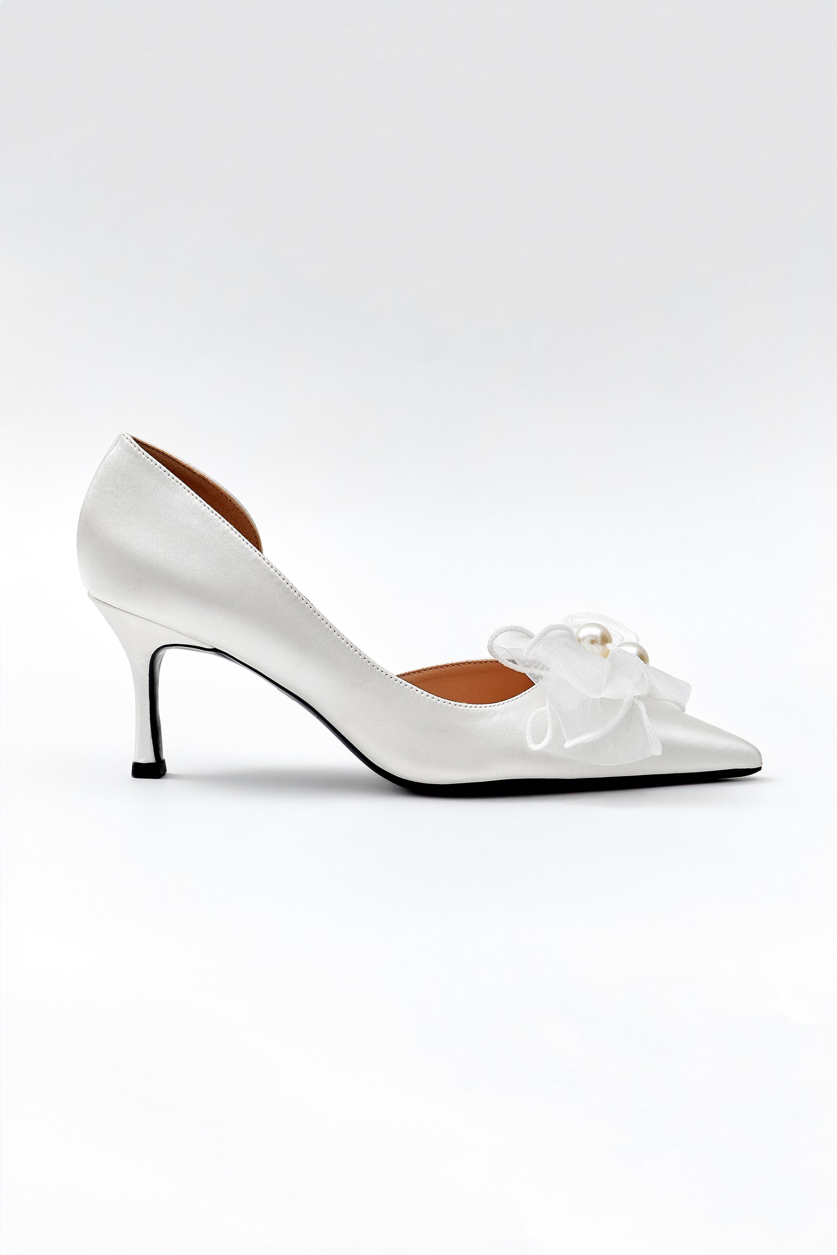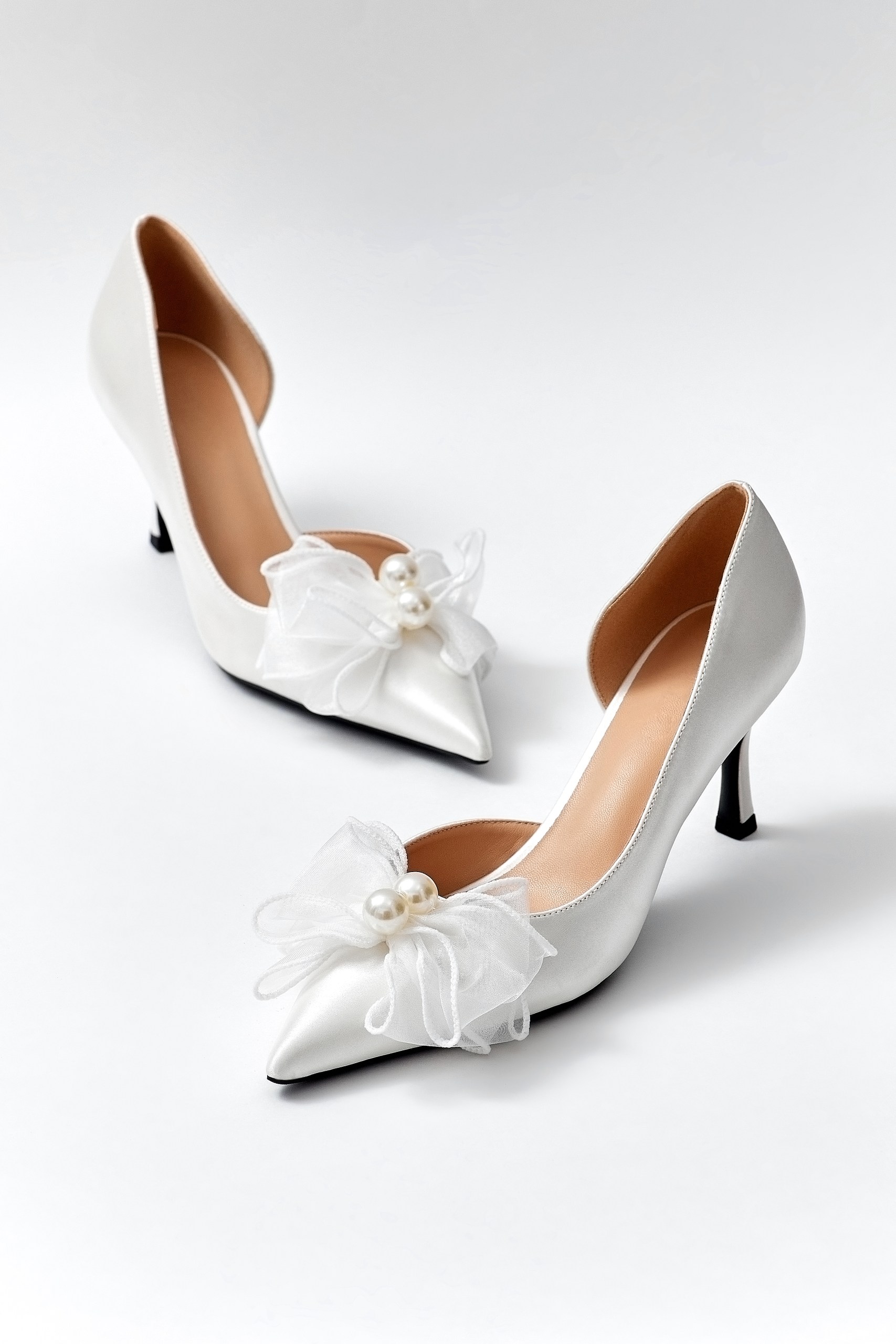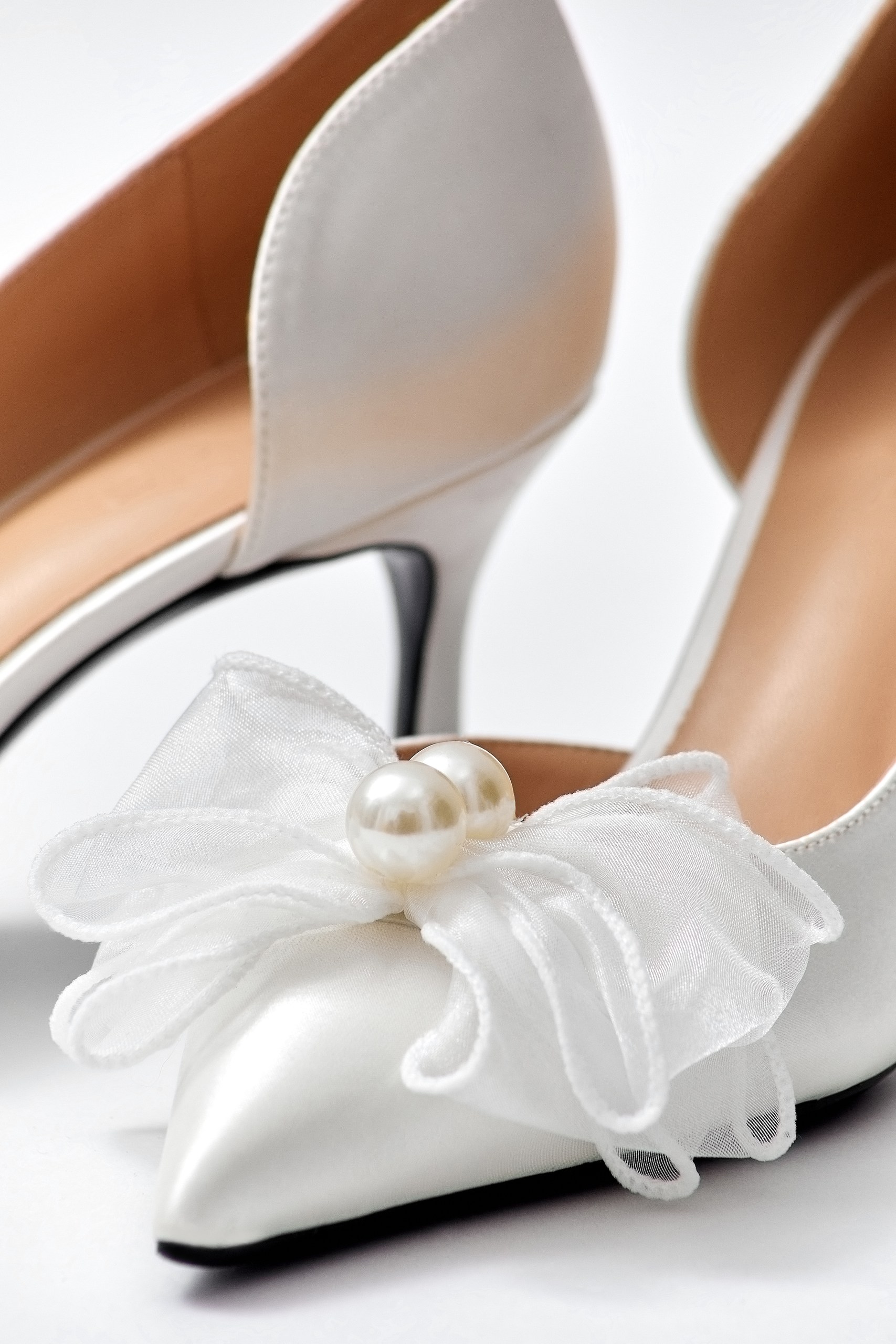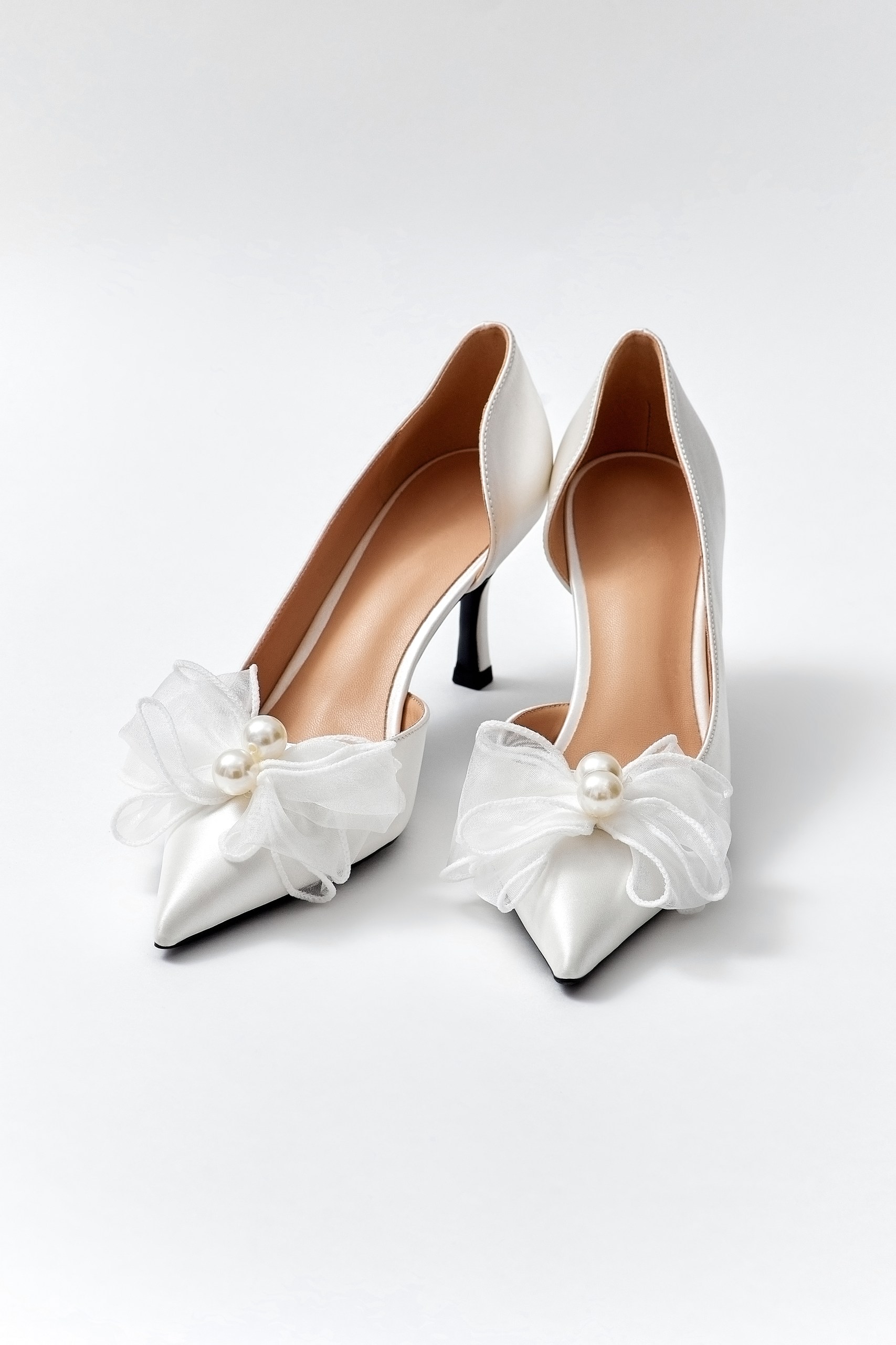 Sivri burun, fiyonklu ve inci detaylı stiletto.