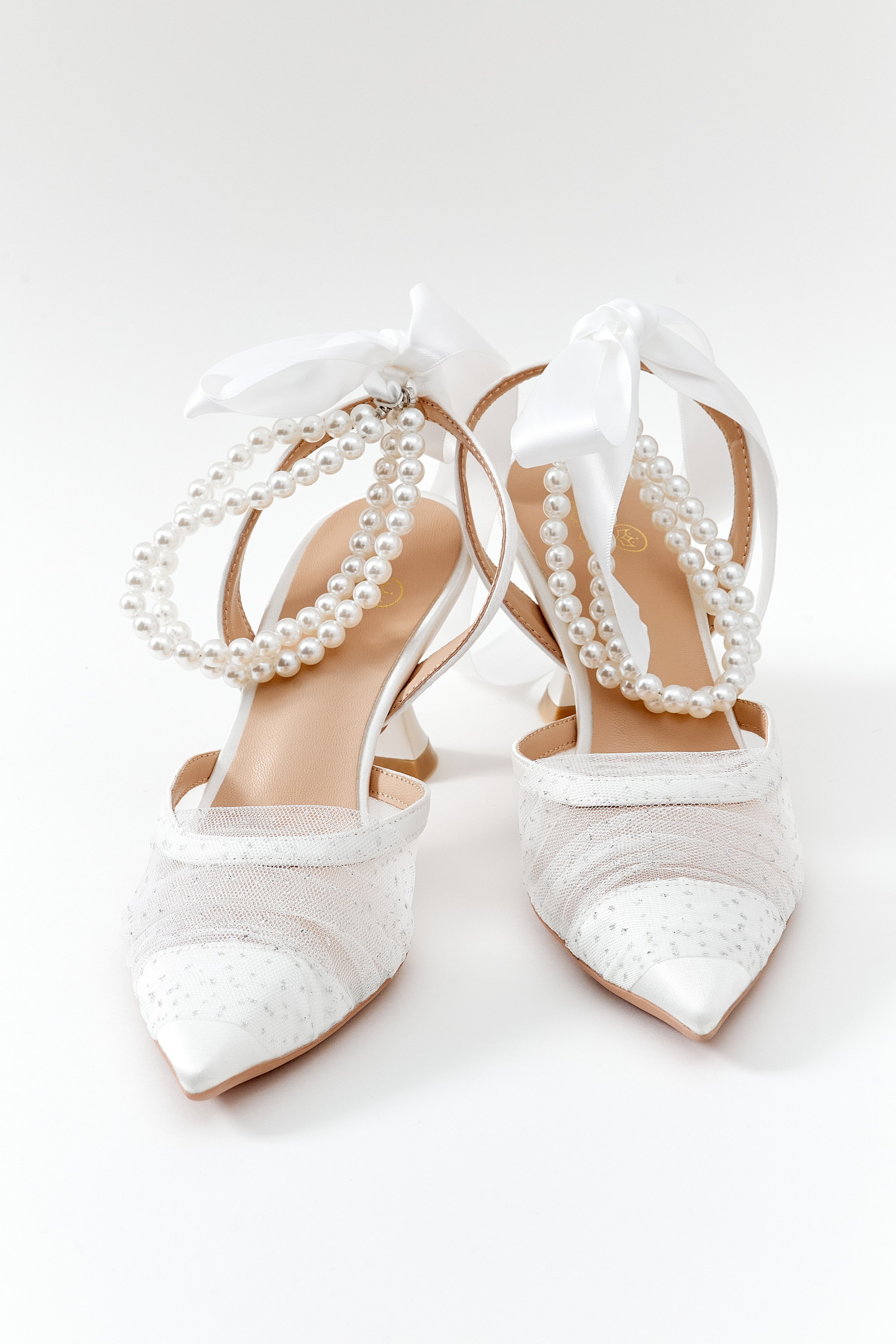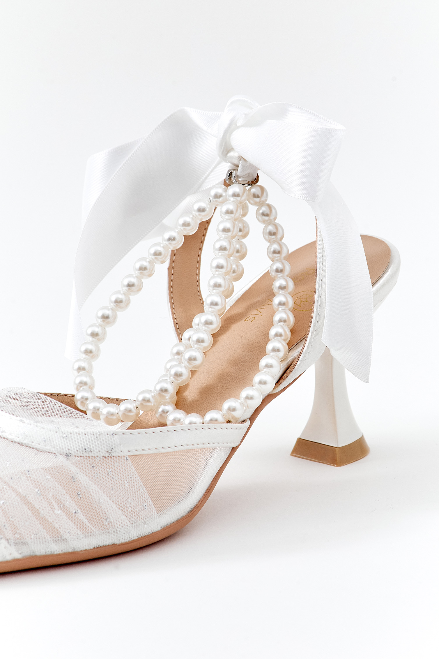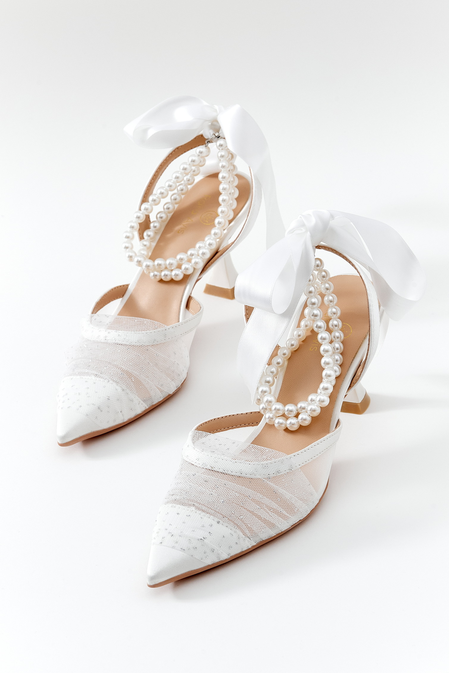 Arkası açık, tüllü, inci ve fiyonklu detaylı bilekten bağlı beyaz ayakkabı.