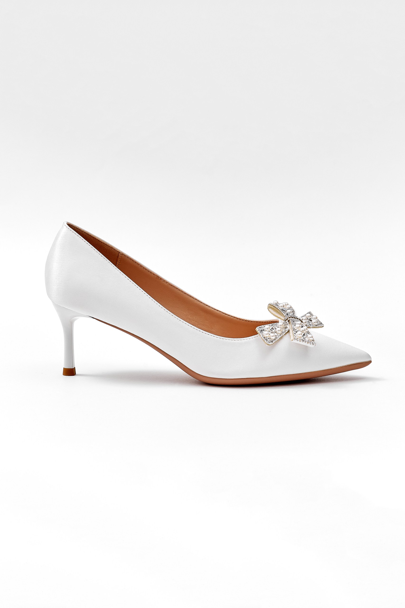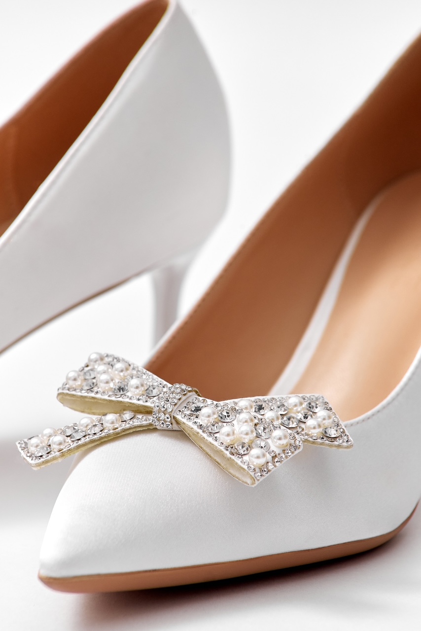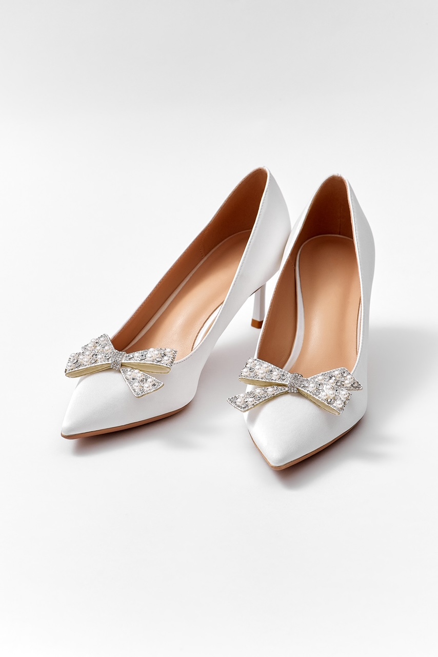 Sivri burunlu, parlak fiyonk detaylı beyaz stiletto.