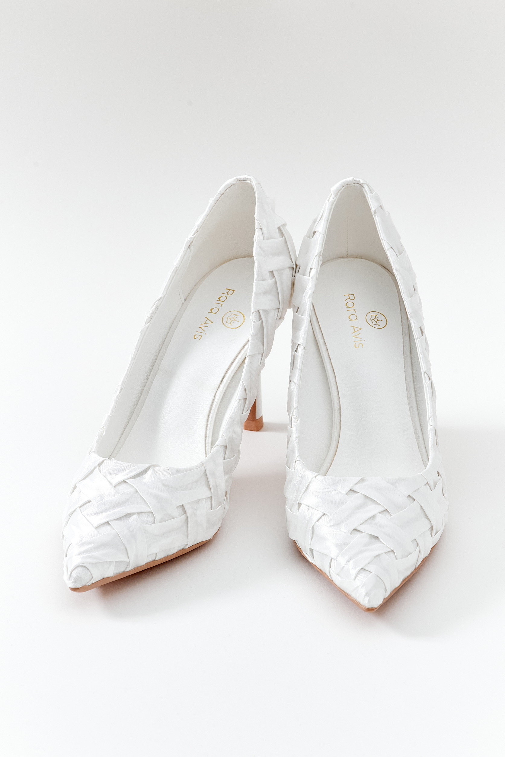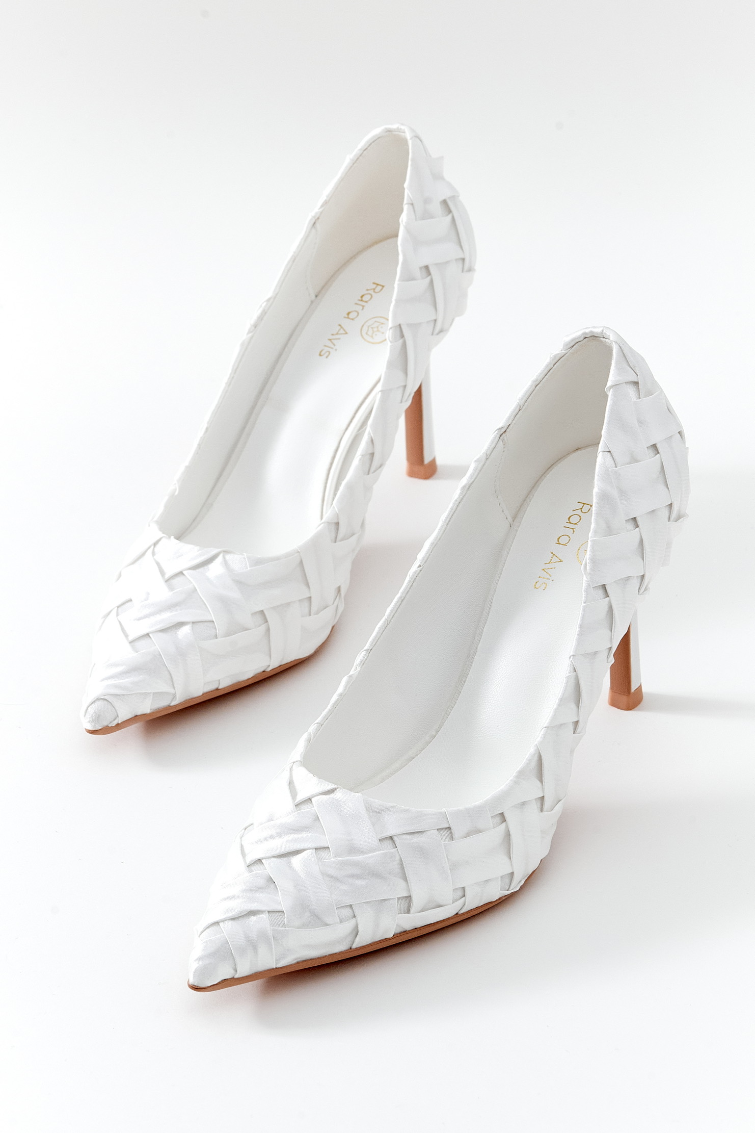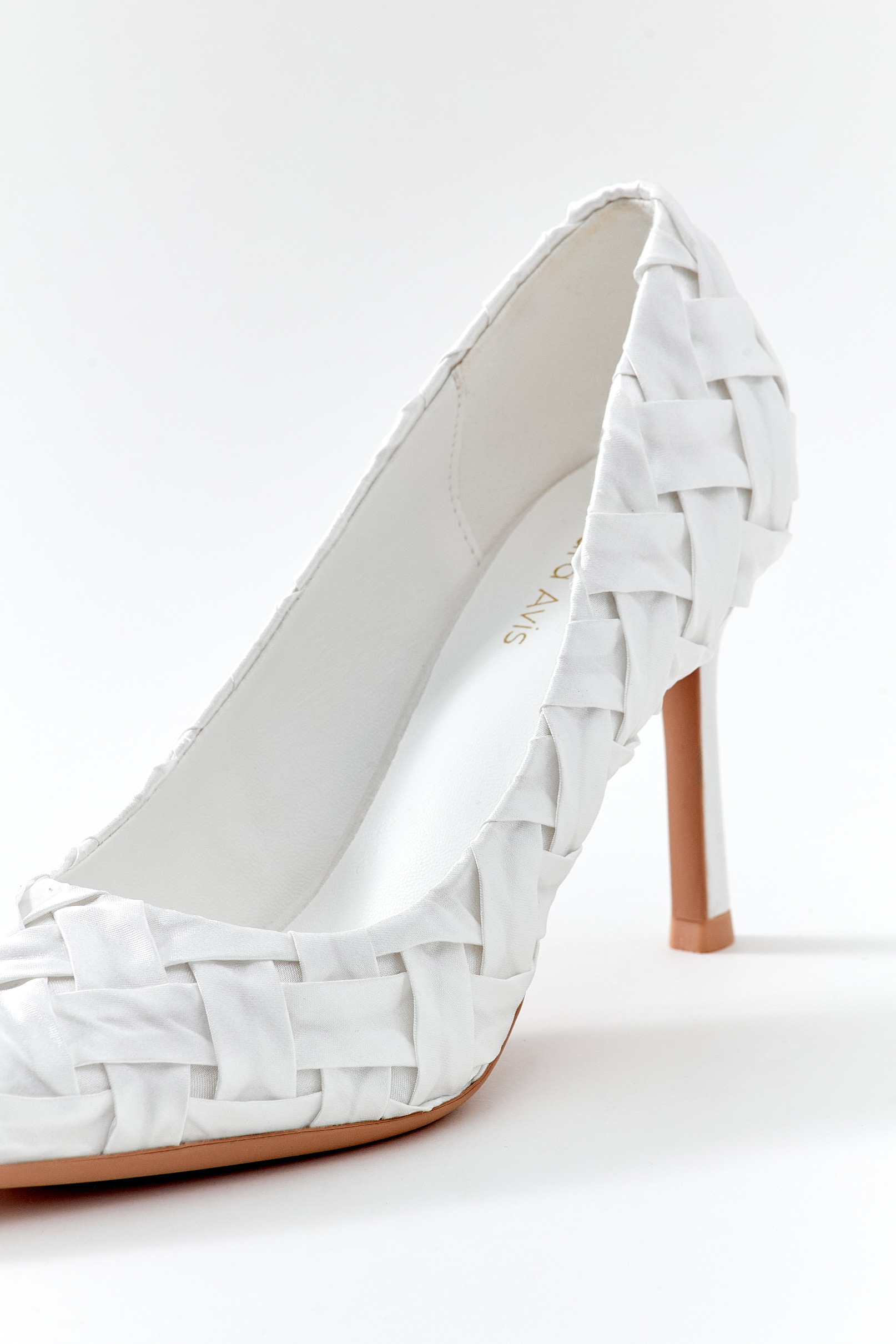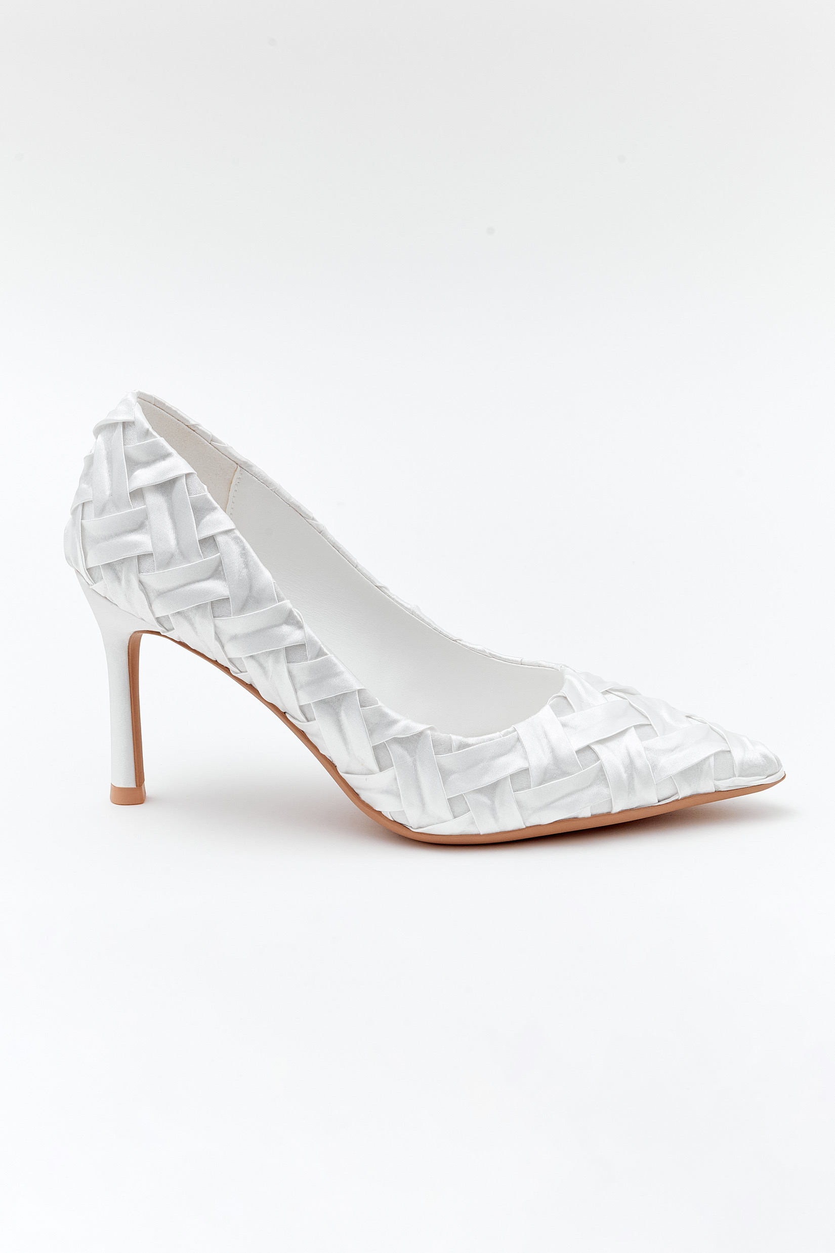 Sivri burunlu, tasarım örgüllü beyaz stiletto. Saten kumaş.