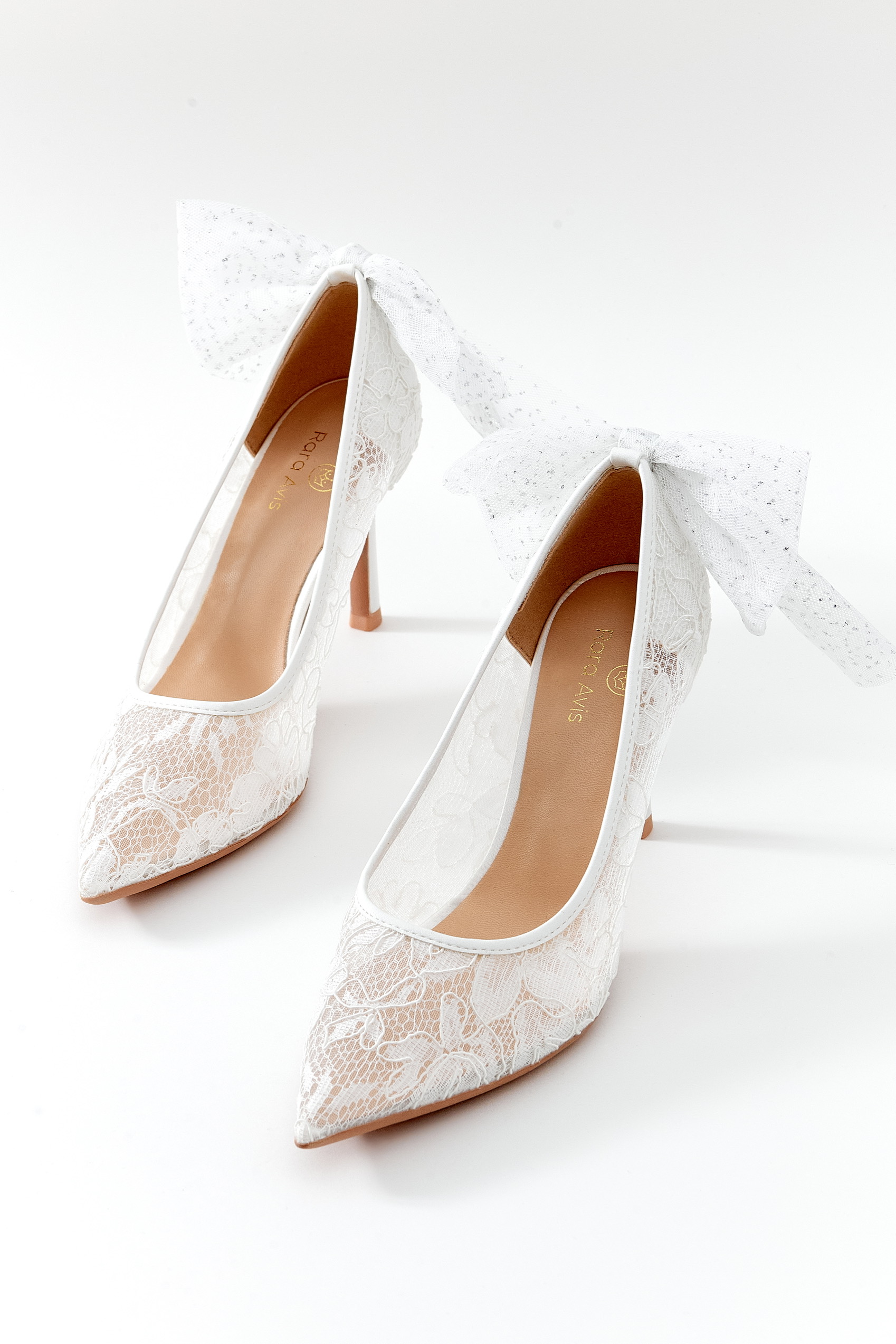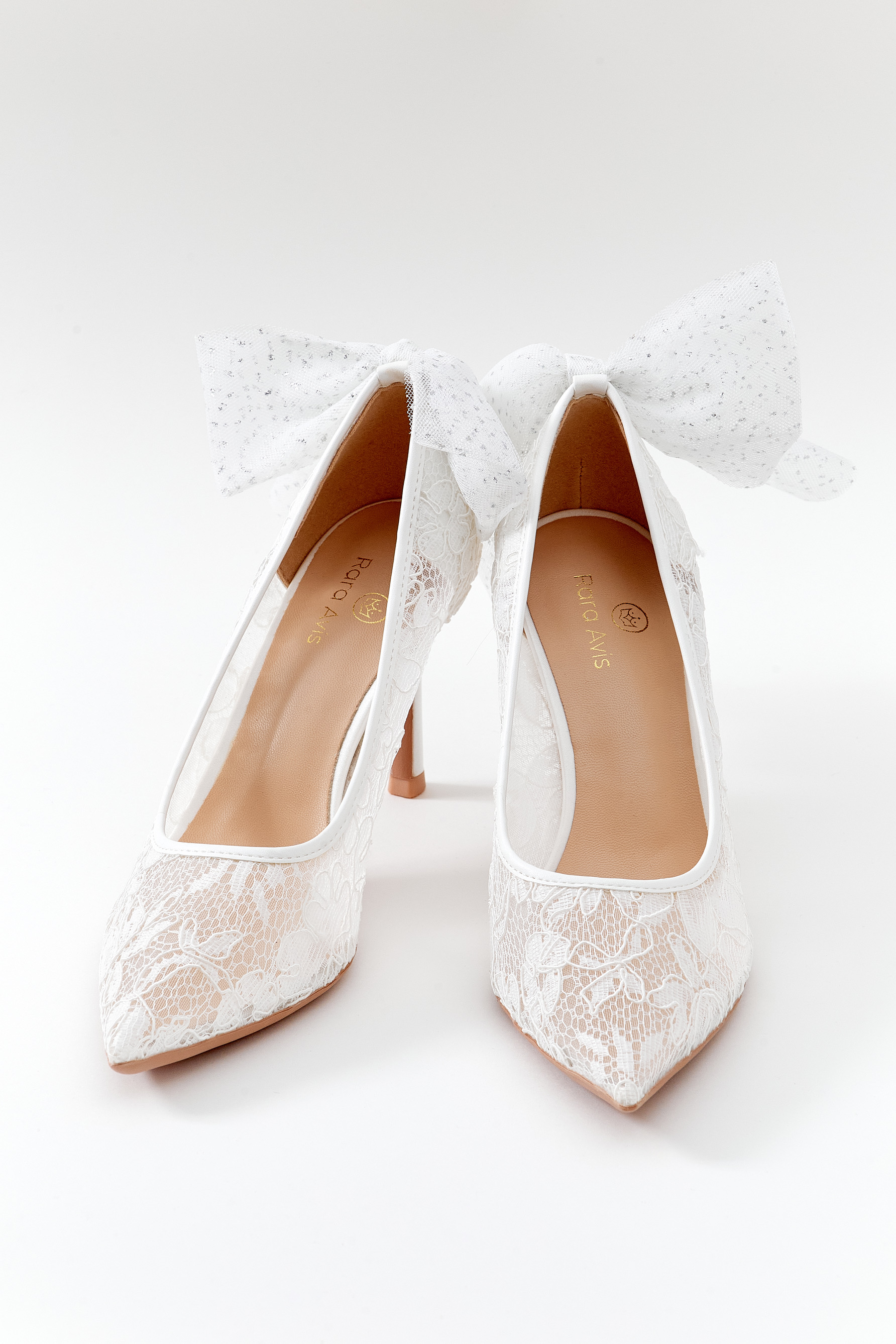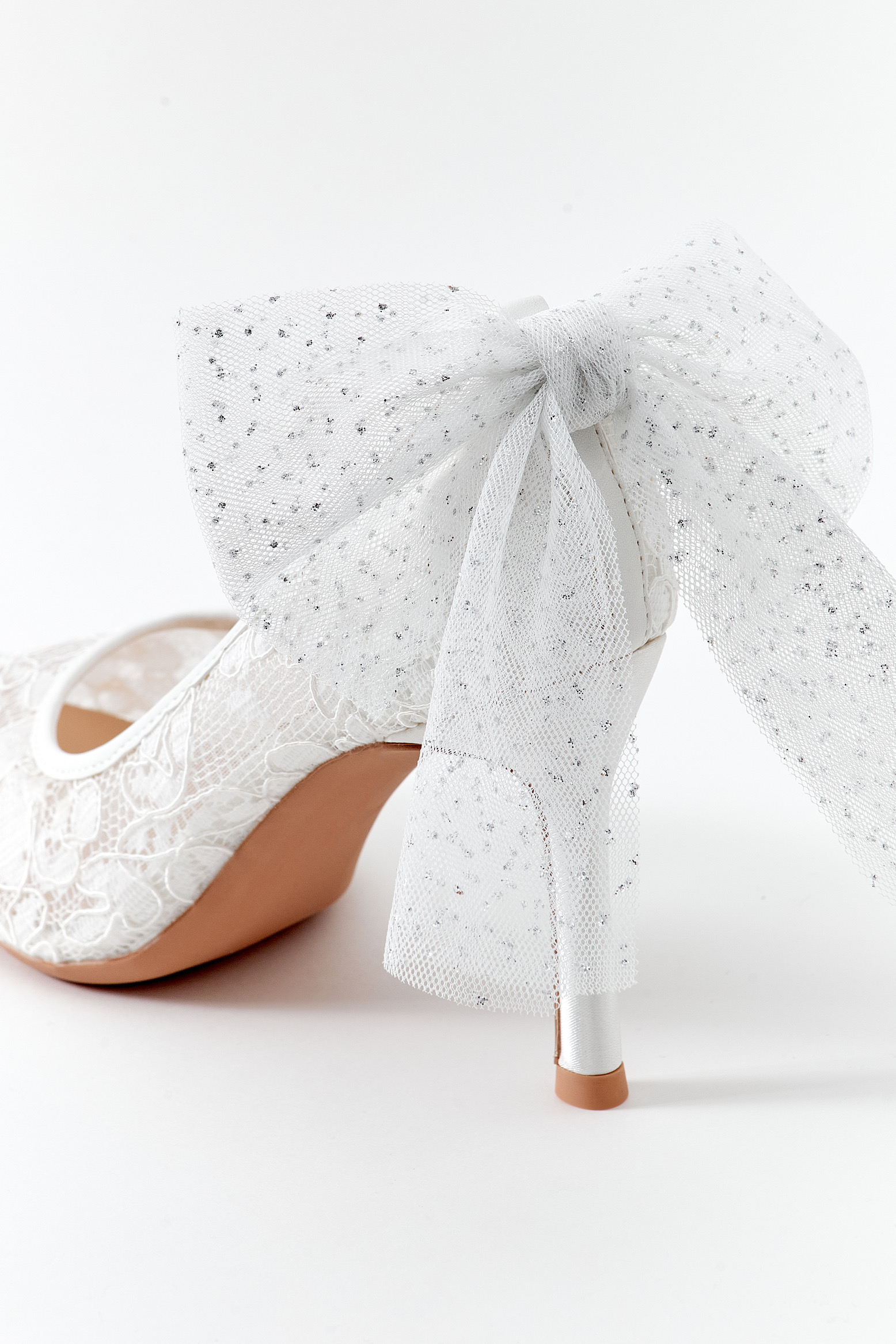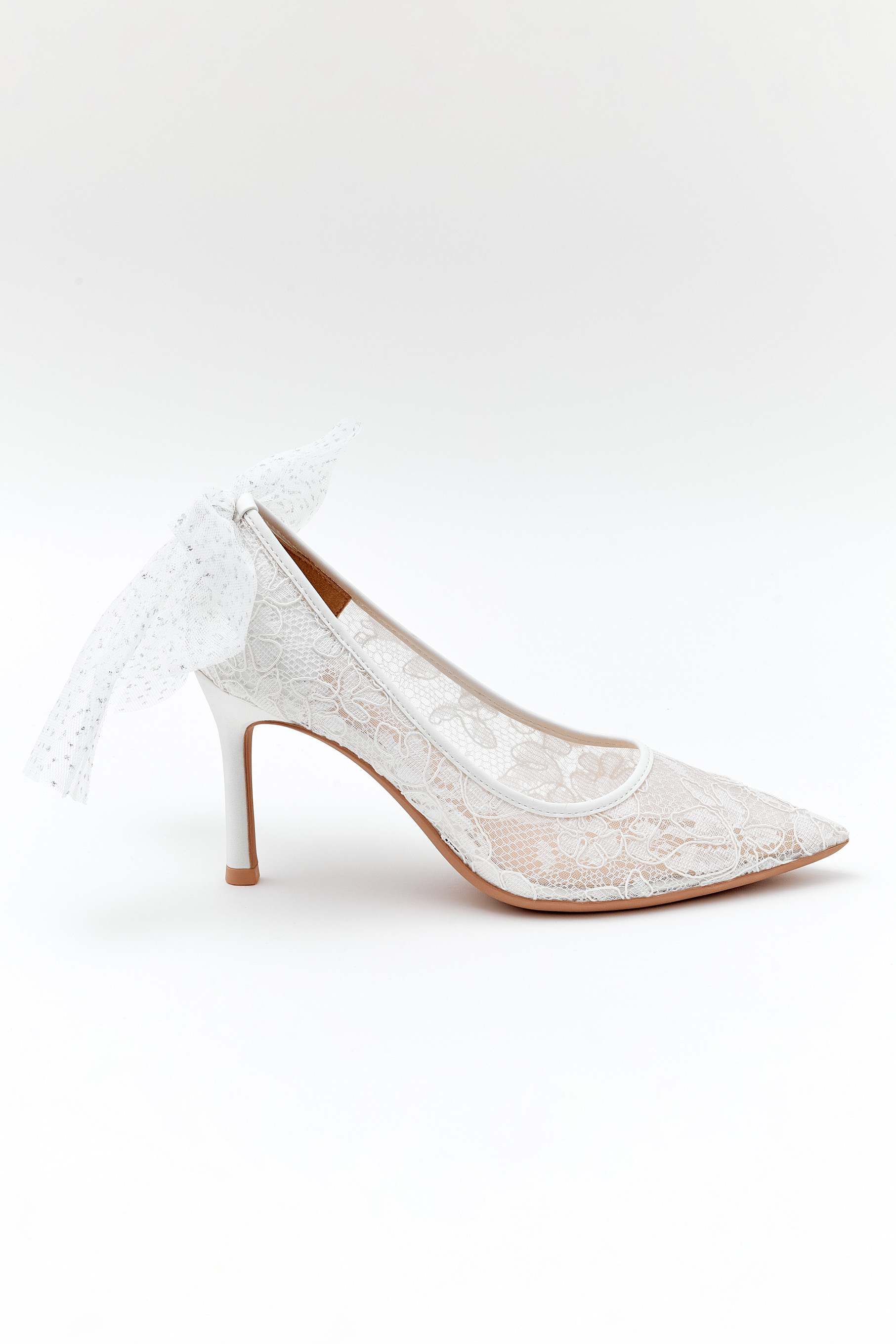 Sivri burun, arakası fiyonklu dantelli stiletto.