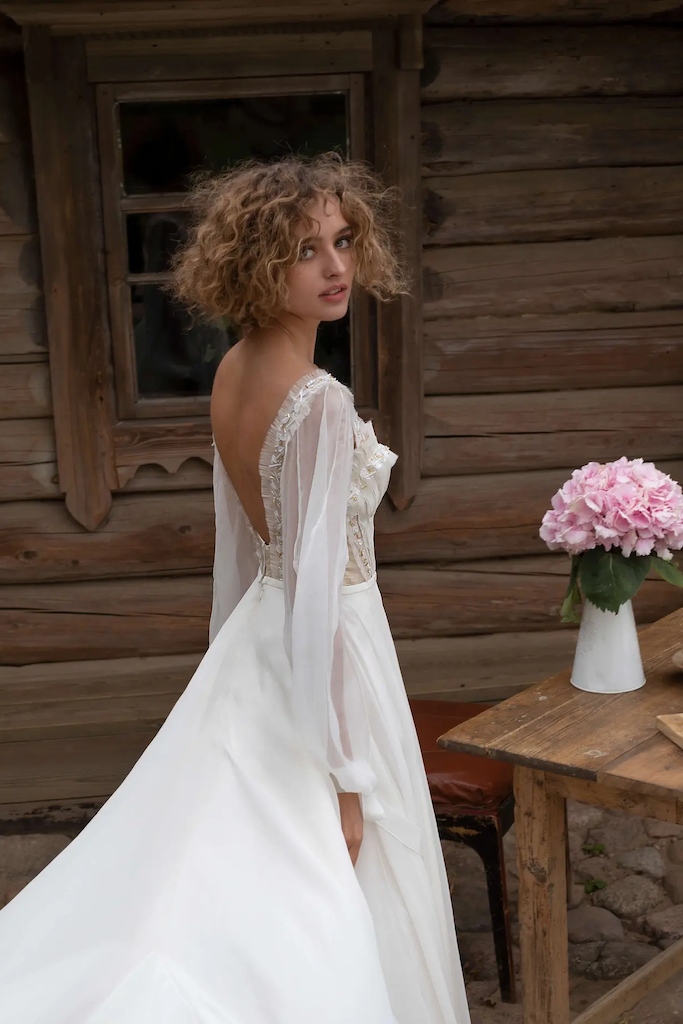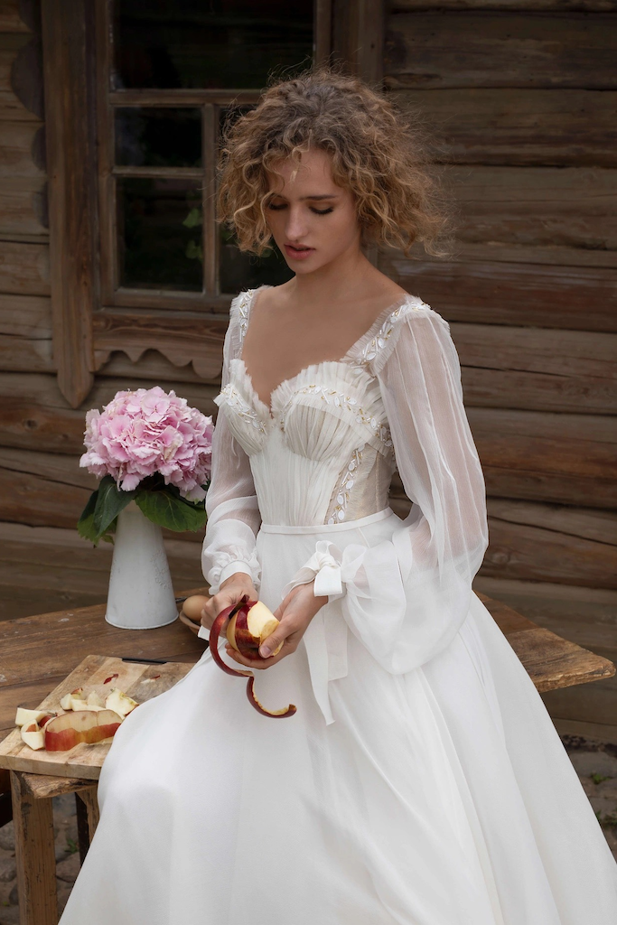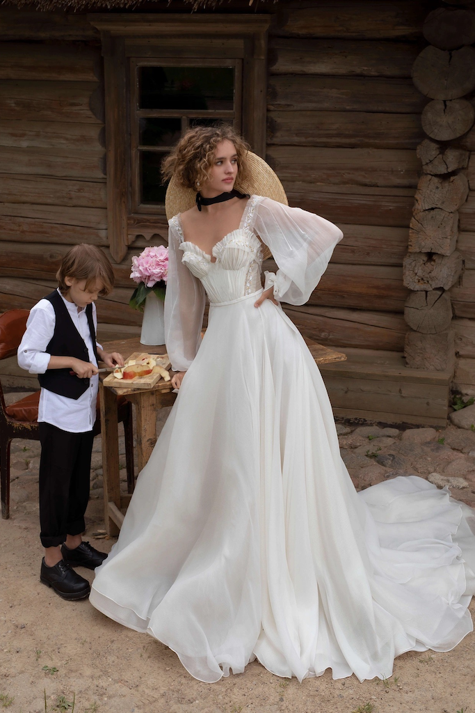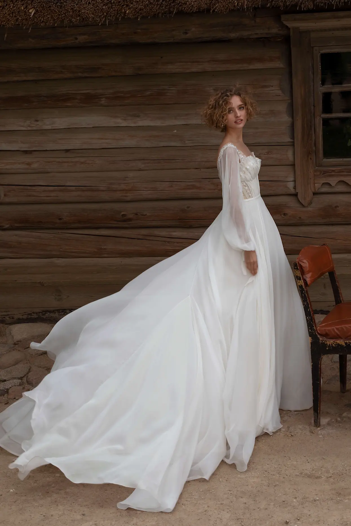 Sizi bu muhteşem gelinlikle tanıştırmak istiyoruz. Balon kollar hafif görünüm yaratırken, üst kısmındaki cup ve kol kısmı fırfır detaylı olup, ince boncuklarla detaylandırılmıştır. Dalgalı etek kısmı her hareketinizle uçuşup büyüleyici görünecektir. Sırt kısmı dekolteli olup, geleneksel ve romantik hava taşıyan bu benzersiz abiyeye çekicilik katıyor. Tamamı ince şifon kumaştan oluşan bu eşsiz parça size peri masalı yaşatacaktır.