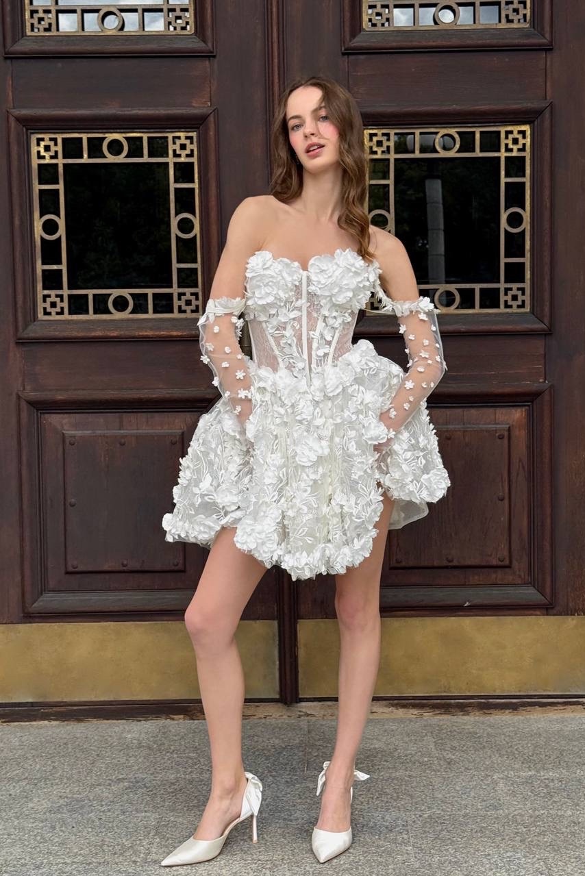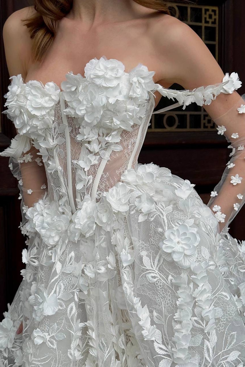 Bu rüya görünümlü tül kumaşlı after elbisenin tamamı üç boyutlu çiçeklerle işenmiş olup bir bütünlük görseli oluşturuyor. Üst kısmı ipli ve ince askılıdır. Alt kısmı çiçeklerle işlenmiş etekten oluşuyor. Elbisenin romantik ve zarif görünümü herkesi hayran bırakacaktır. Düğün gününüzde herkesi büyülemeye hazır olun!