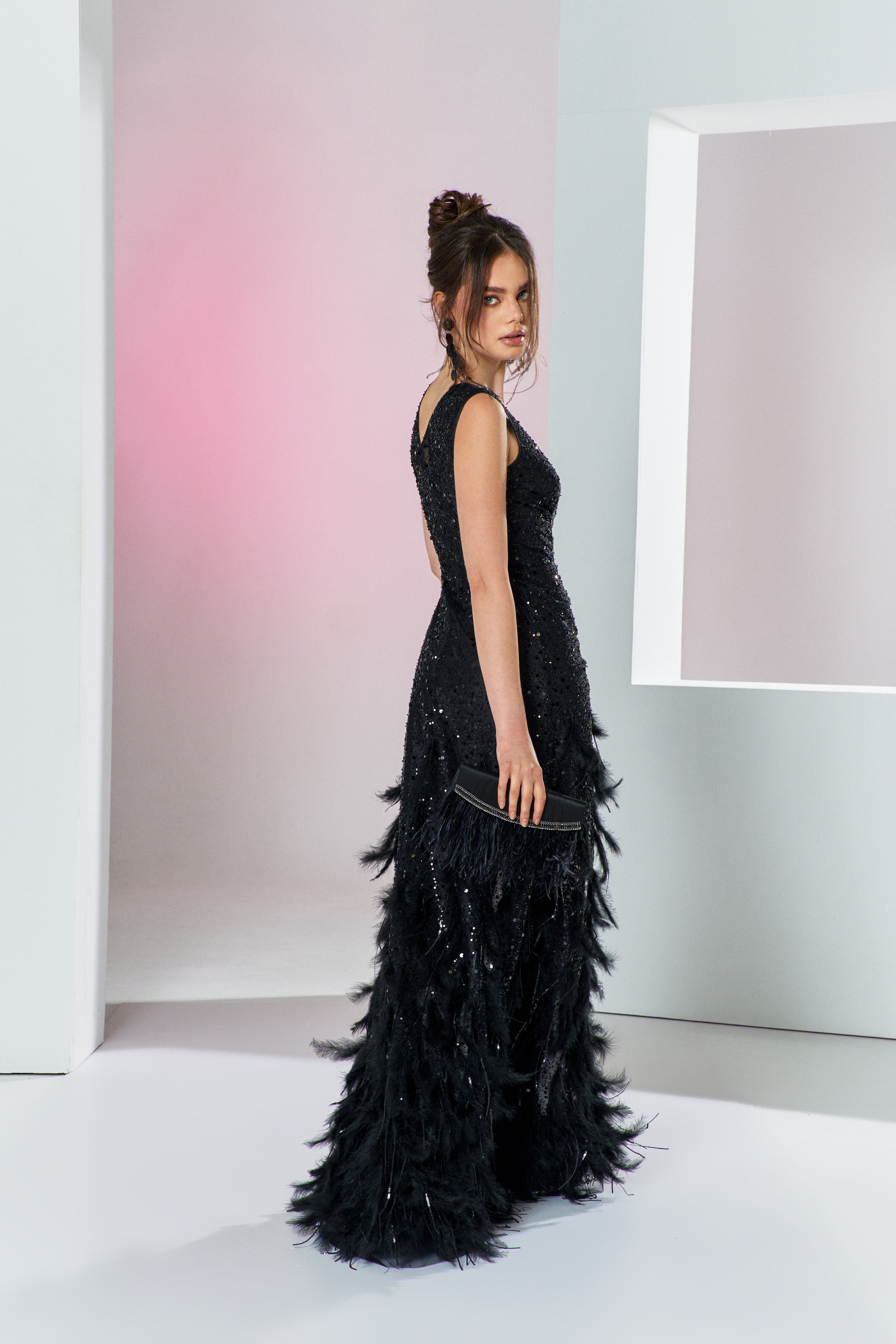Tüylü siyah parlak gece elbisesi
