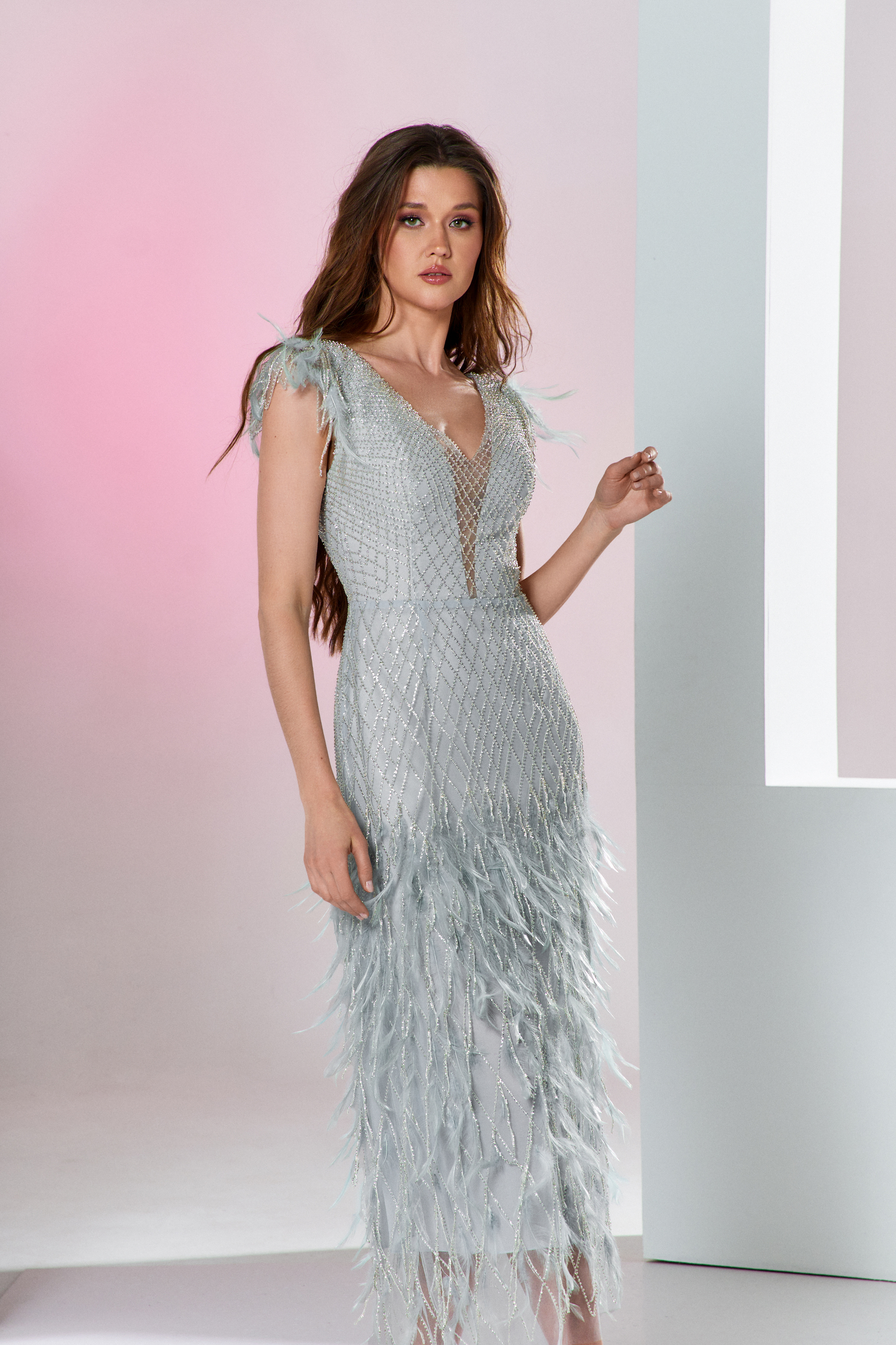Tüylü midi gece elbisesi