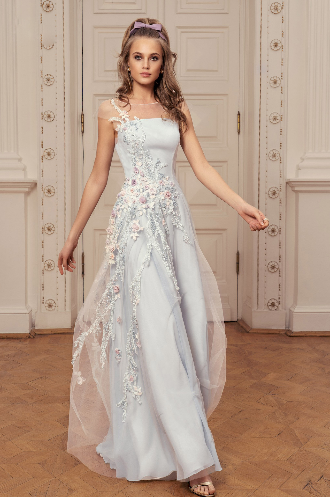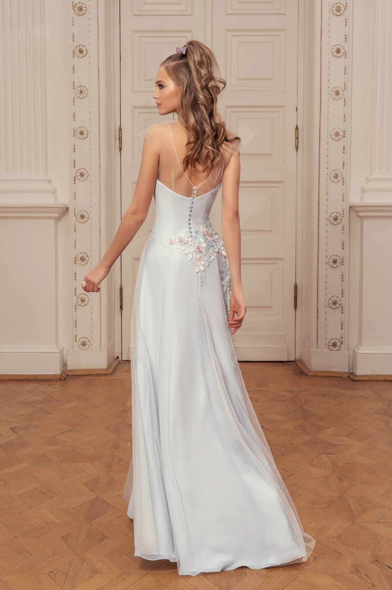 Saten üstündeki tüle işlenmiş 3 boyutlu çiçeklerle sade zarafetten yana olan gelinler için mükemmel bir parça. Transparan yakası sırta doğru derin bir V şeklinde iniyor ve gizli fermuarın yanındaki inci düğmeler şık görünümü tamamlıyor.